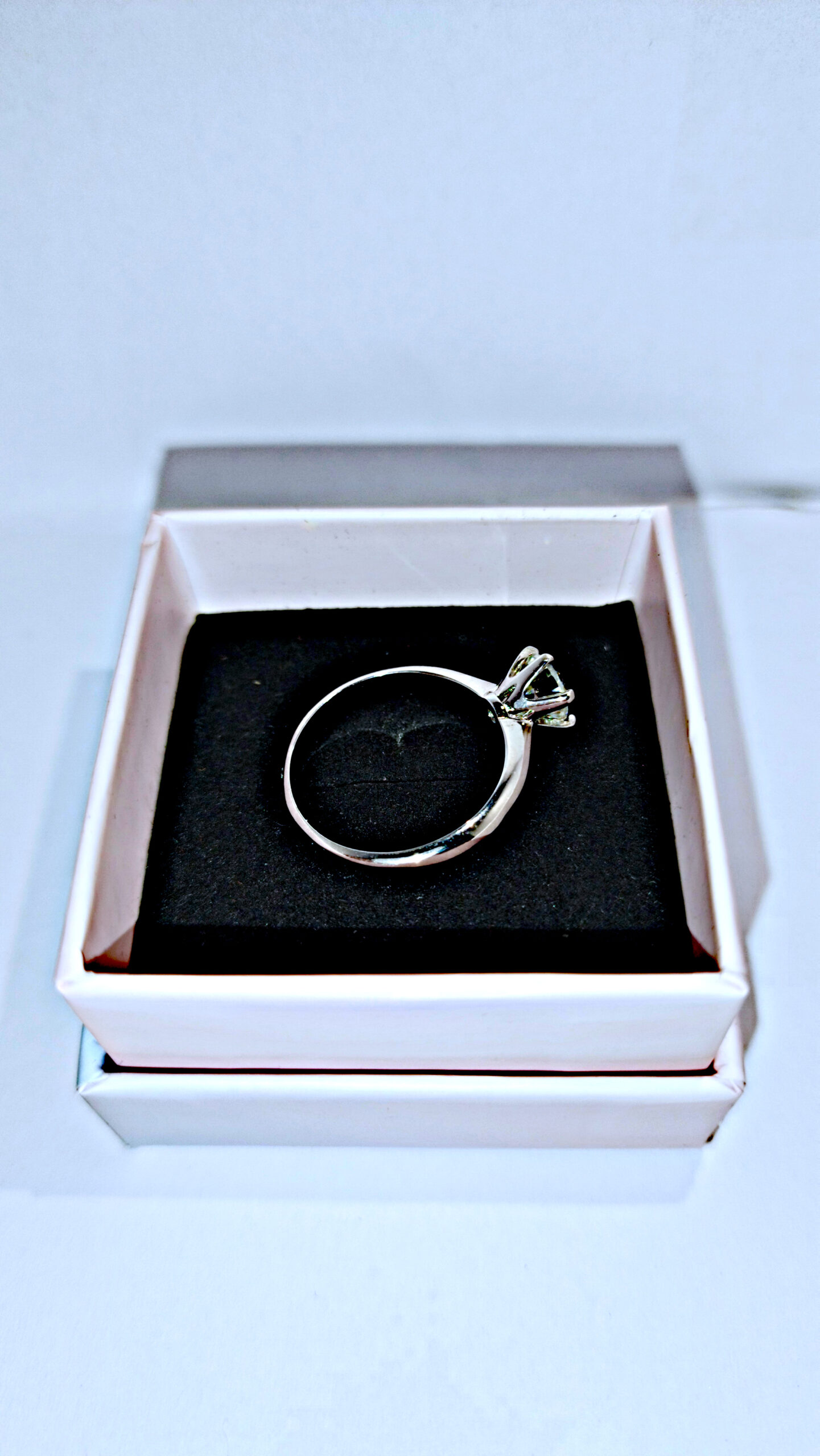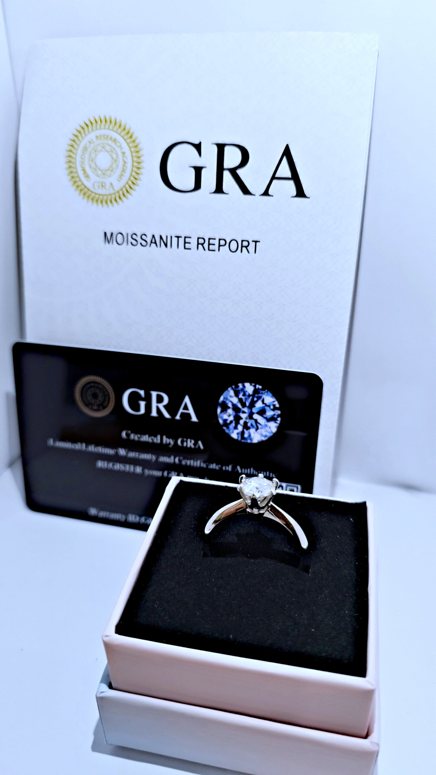 Elegancki pierścionek z kamieniem moissanitowym, zaprezentowany w stylowym różowym pudełku jubilerskim. Do zestawu dołączony jest oryginalny certyfikat autentyczności GRA oraz raport gemmologiczny potwierdzający jakość i pochodzenie kamienia. Idealny wybór na prezent zaręczynowy, rocznicę lub wyjątkową okazję.